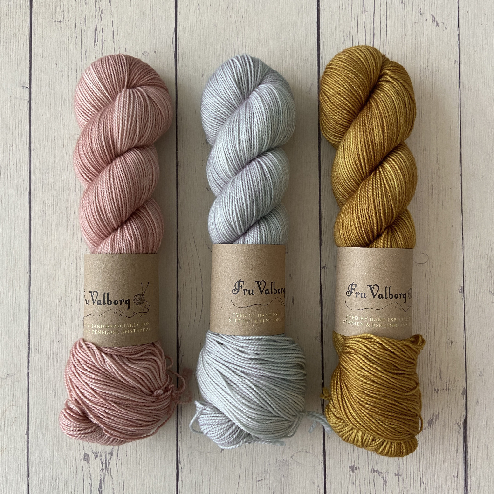These three skein kits provide enough yarn for the full shawl, and are inspired by the samples shown here.