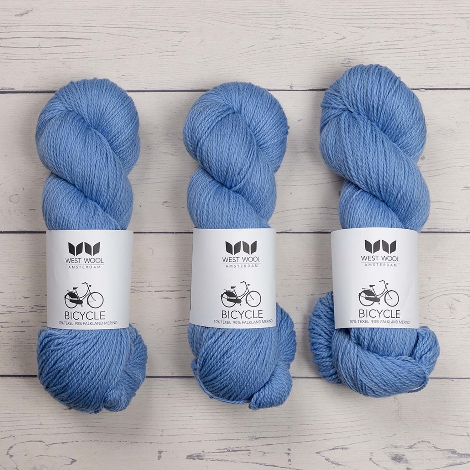 Bicycle ist eine zweifädiges Garn, gesponnen aus 90% Falkland Merino und 10% der Wolle der ursprünglich holländische Schafsorte "Texel". Es besitzt die Weichheit von Merino aber gibt der Maschen ein gewisse Standkraft wodurch Zopfmuster, Spitzen oder Patentmuster besonders schön hervortreten. Cornflower ist ein mittelhelles Blau.