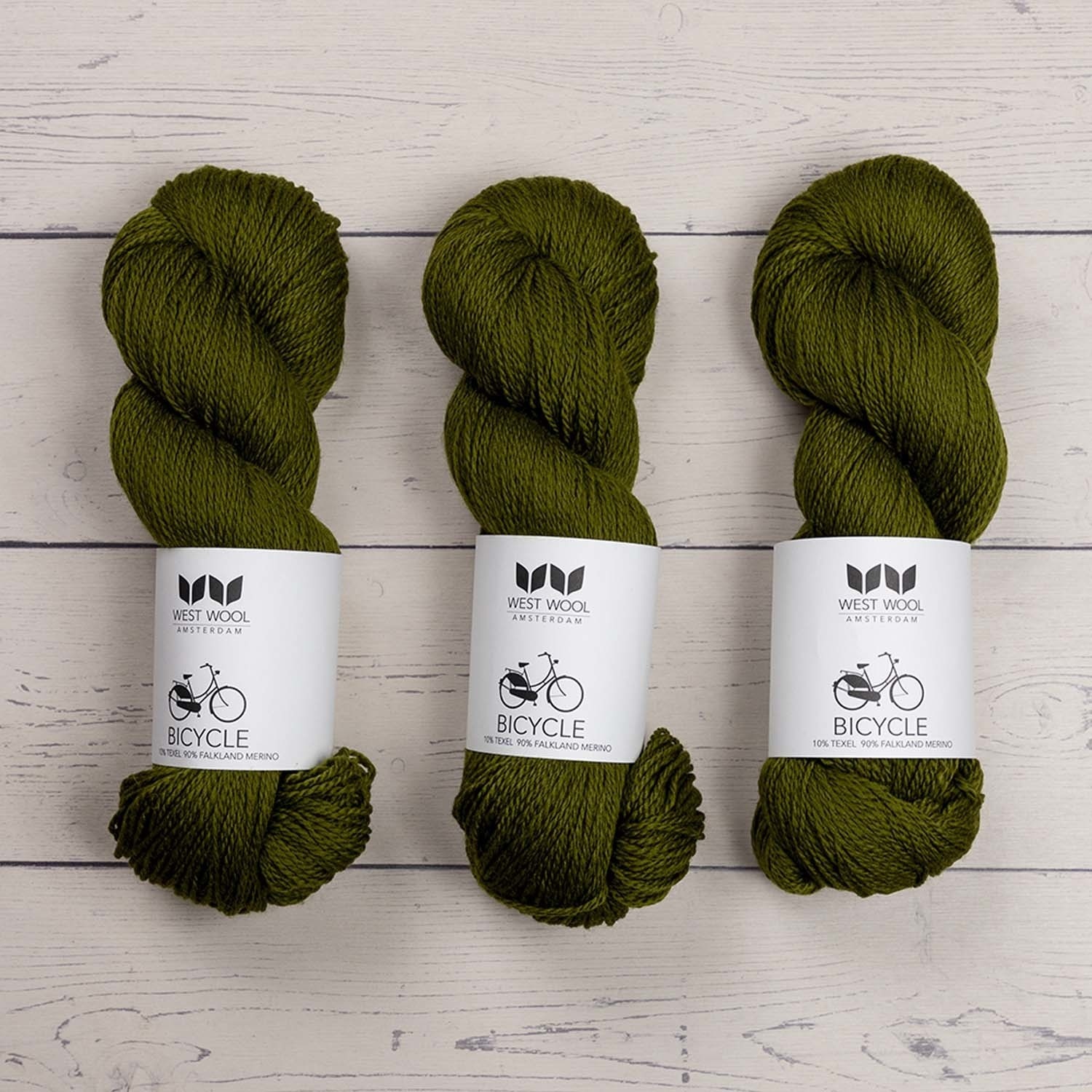 Bicycle ist eine zweifädiges Garn, gesponnen aus 90% Falkland Merino und 10% der Wolle der ursprünglich holländische Schafsorte "Texel". Es besitzt die Weichheit von Merino aber gibt der Maschen ein gewisse Standkraft wodurch Zopfmuster, Spitzen oder Patentmuster besonders schön hervortreten. Green Olive ist ein frühlingshaftes, halbdunkles Grün.