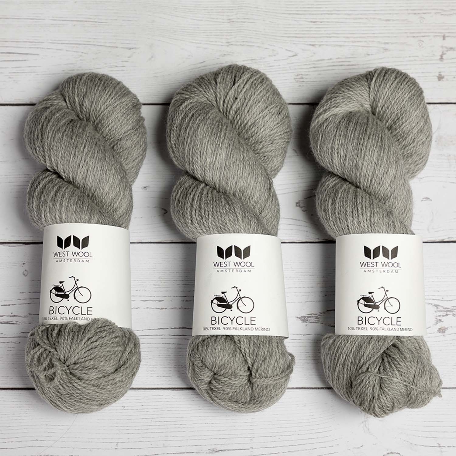 Bicycle ist eine zweifädiges Garn, gesponnen aus 90% Falkland Merino und 10% der Wolle der ursprünglich holländische Schafsorte "Texel". Es besitzt die Weichheit von Merino aber gibt der Maschen ein gewisse Standkraft wodurch Zopfmuster, Spitzen oder Patentmuster besonders schön hervortreten. Pebble ist ein kühles, meliertes Hellgrau.