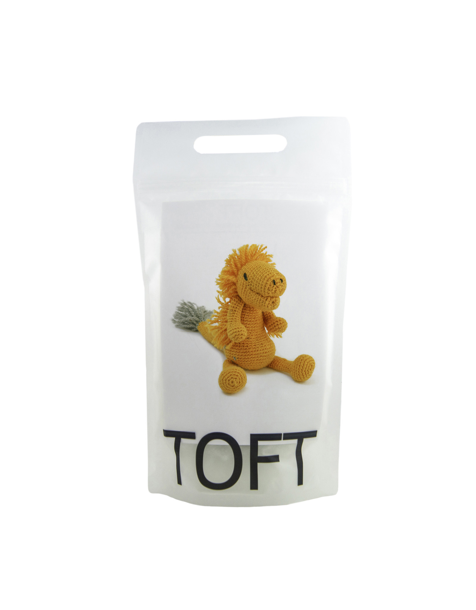 THIS KIT CONTAINS: 75g of DK wool in 'Yellow', 25g of DK wool in 'Shale', toy stuffing, 3mm crochet hook, wool needle, and a postcard pattern inside a reusable TOFT project bag.