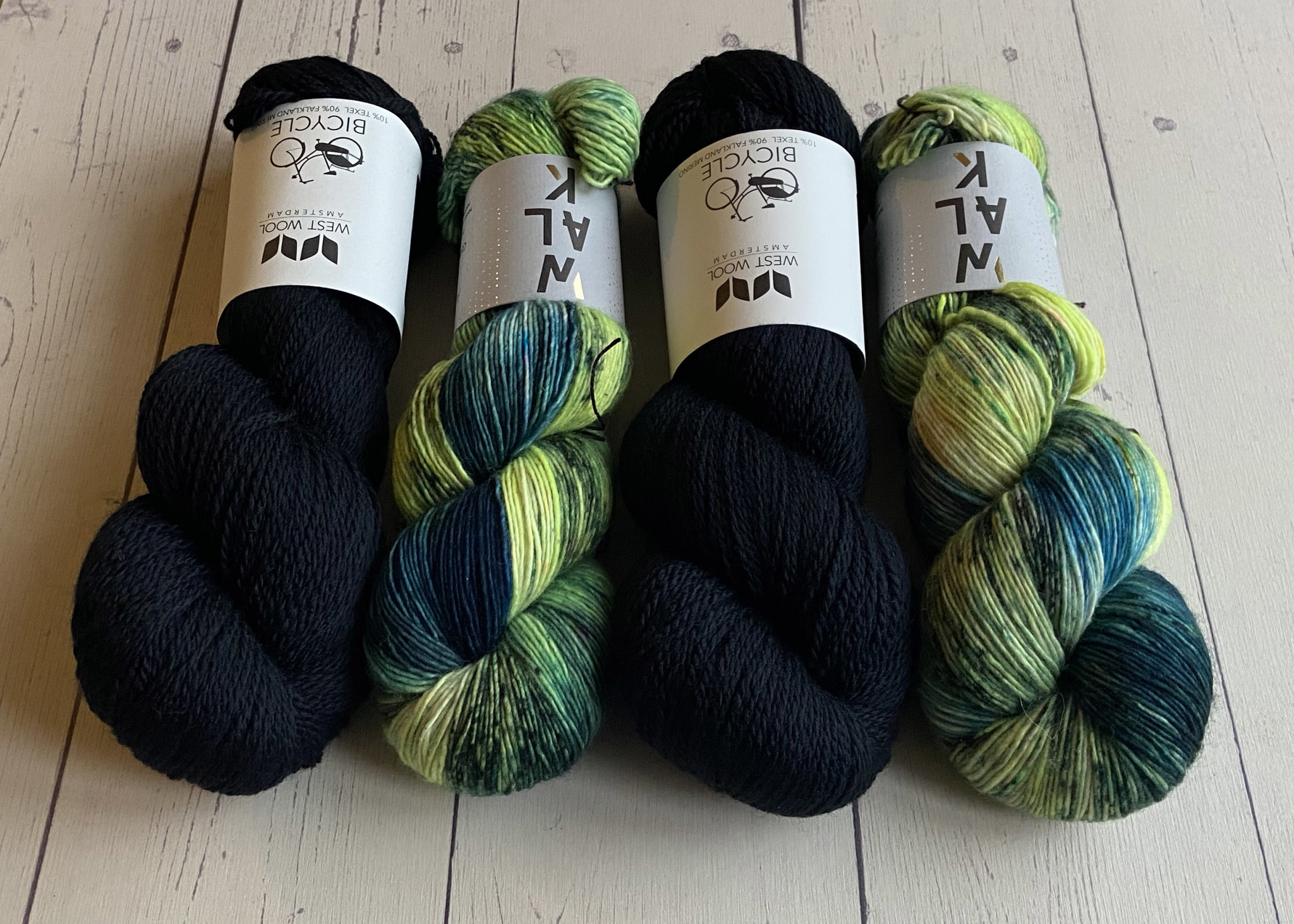 The textural contrast of woolly West Wool Bicycle with buttery single plied Walk Collection Cottage Merino adds visual impact to your final project.