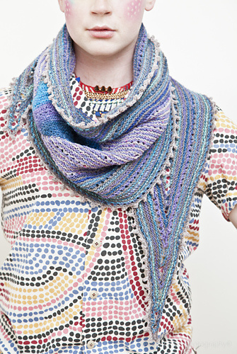 This shawl is a variation based on the popular Color Craving design from the Westknits Mystery Shawl KAL 2013. Two sections use yarn over shaping to give the illusion of short rows. A diamond shape is formed while being attached to the matching striped shapes. Afterward, more stripes and yarn over shaping create a large border around the entire perimeter. A picot bind off finishes the unique elongated shape.