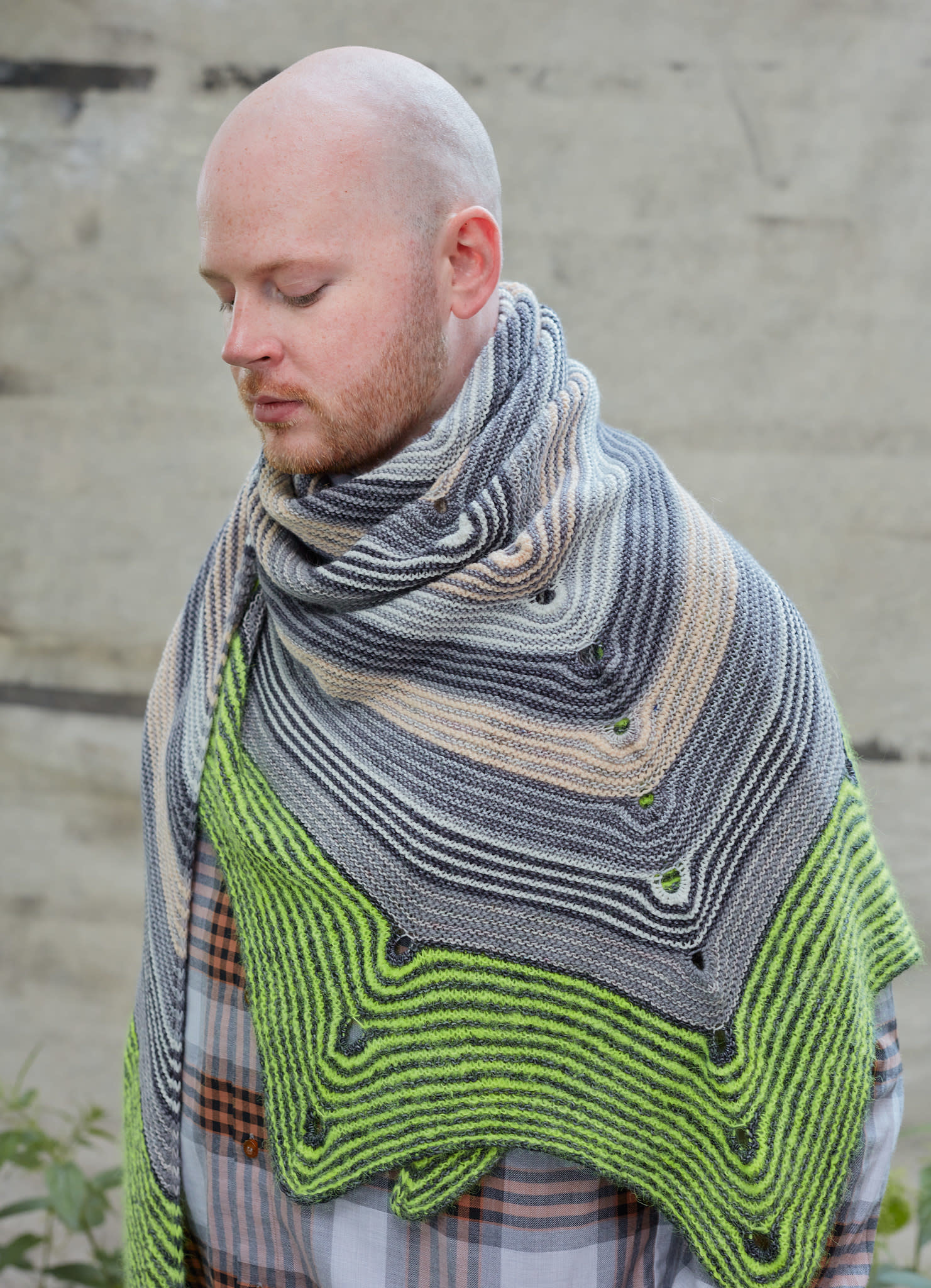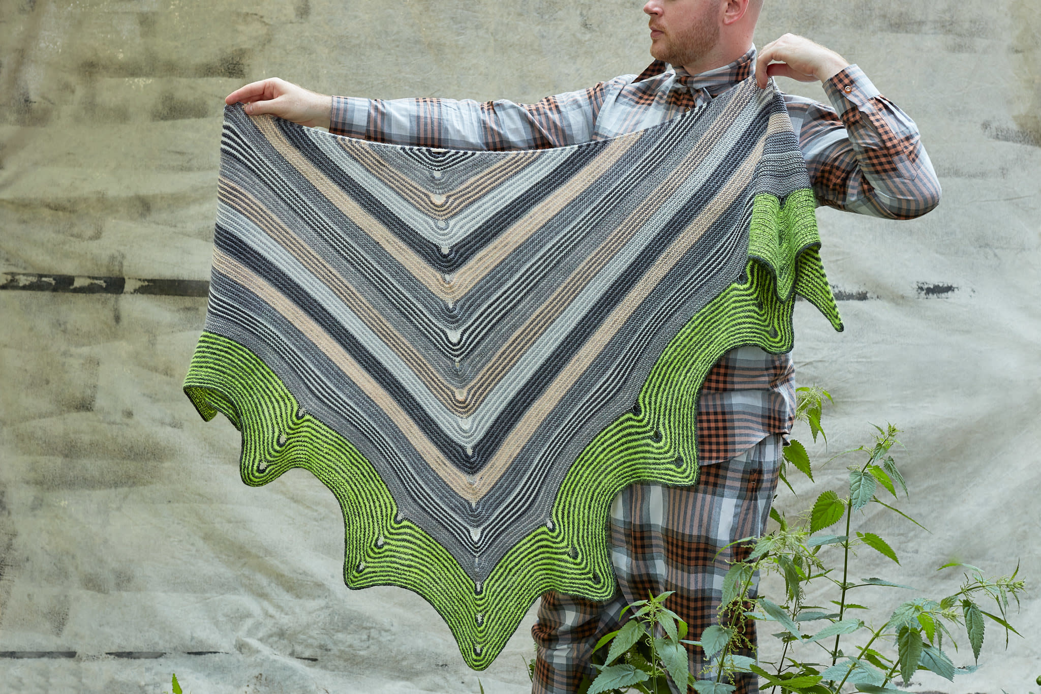 This top-down triangular shawl is an easy-to-knit project to play with colourful stripes. Large increases create holes in the centre of the shawl. The pattern is written for nine shades of fingering weight yarn, but you can customise your colours to feature as many colours as you like. I-cord edges frame this playful striped shawl.