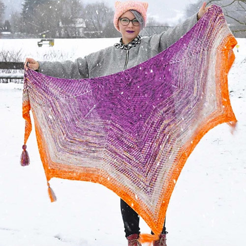 Ewe Rock by Susanne Sommer super-sized shawl is a perfect accessory to rock this freezing winter in style. Wrap it around your neck and keep warm on your trips out into the cold, or wrap it around your shoulders to stay cozy and warm inside. Ewe Rock is knit top-down in one-color and two-color brioche and garter stitch in a stunning four-color fade. The tassels accentuate the star shape, but are of course entirely optional.