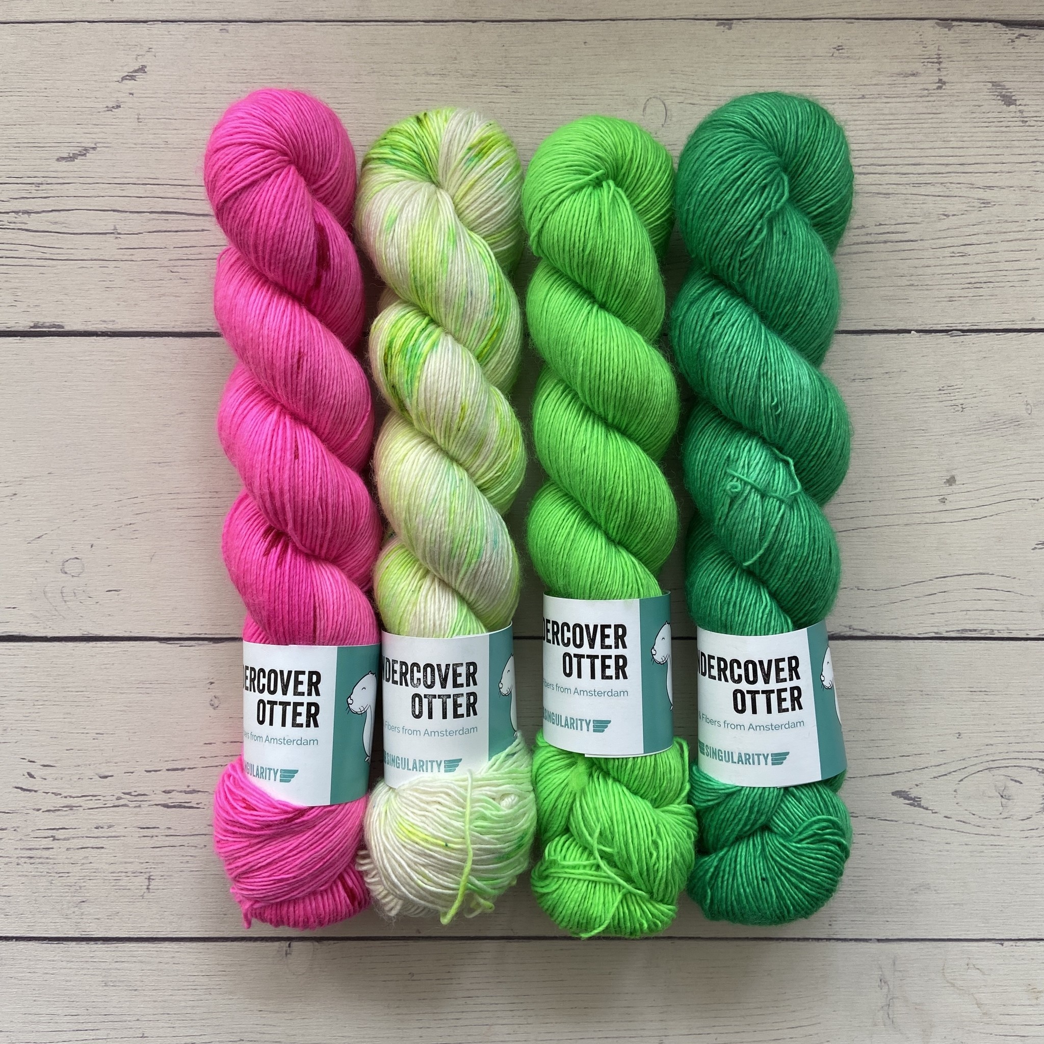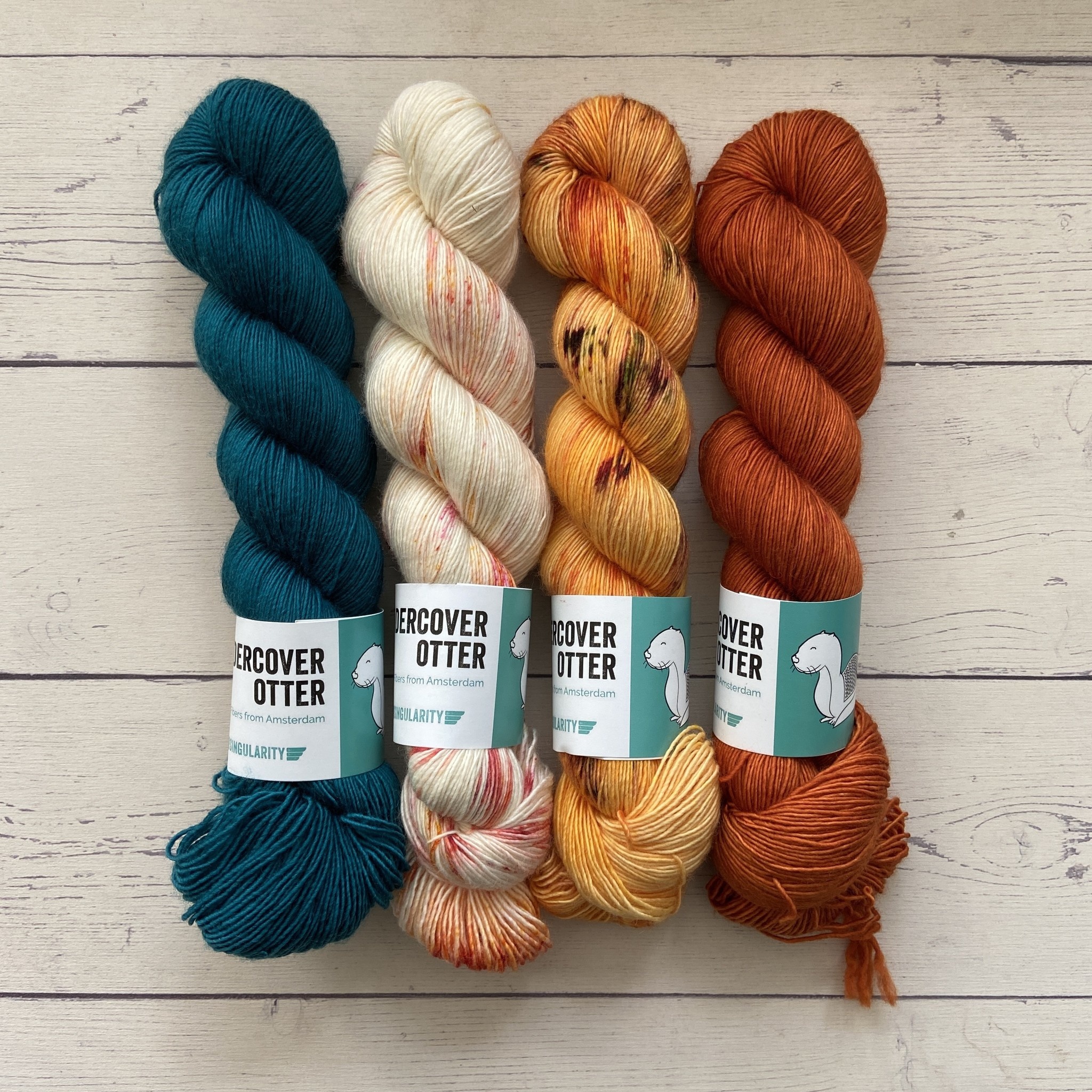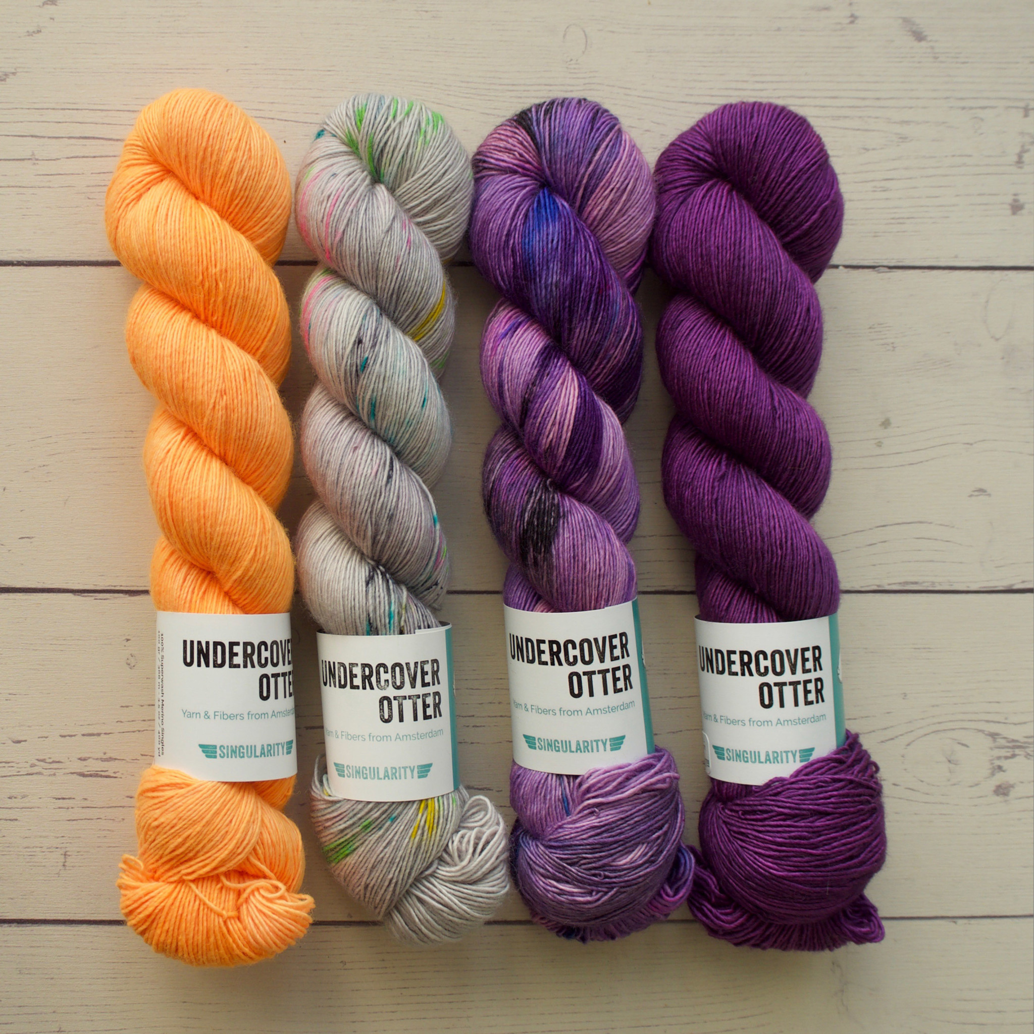 This four skein kit provides enough UNDERCOVER OTTER SINGULARITY yarn to knit the full size shawl with tassels in our interpretation of the original colours, or a fun alternate palette!