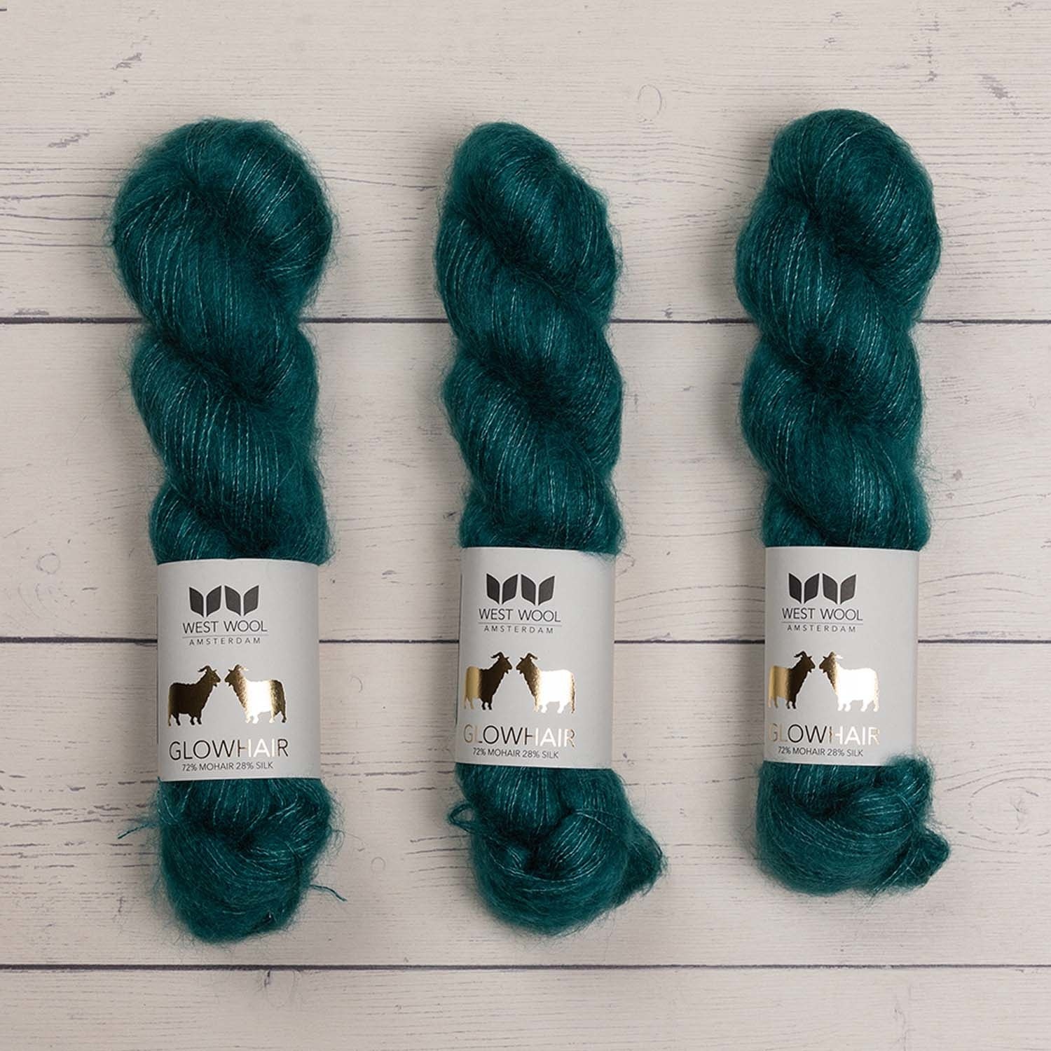 Glowhair is a mohair and silk blend that is soft, fluffy, and silky all at once. The higher content of silk in this yarn gives it a really lovely drape! Norway is a lush forest inspired blue green.