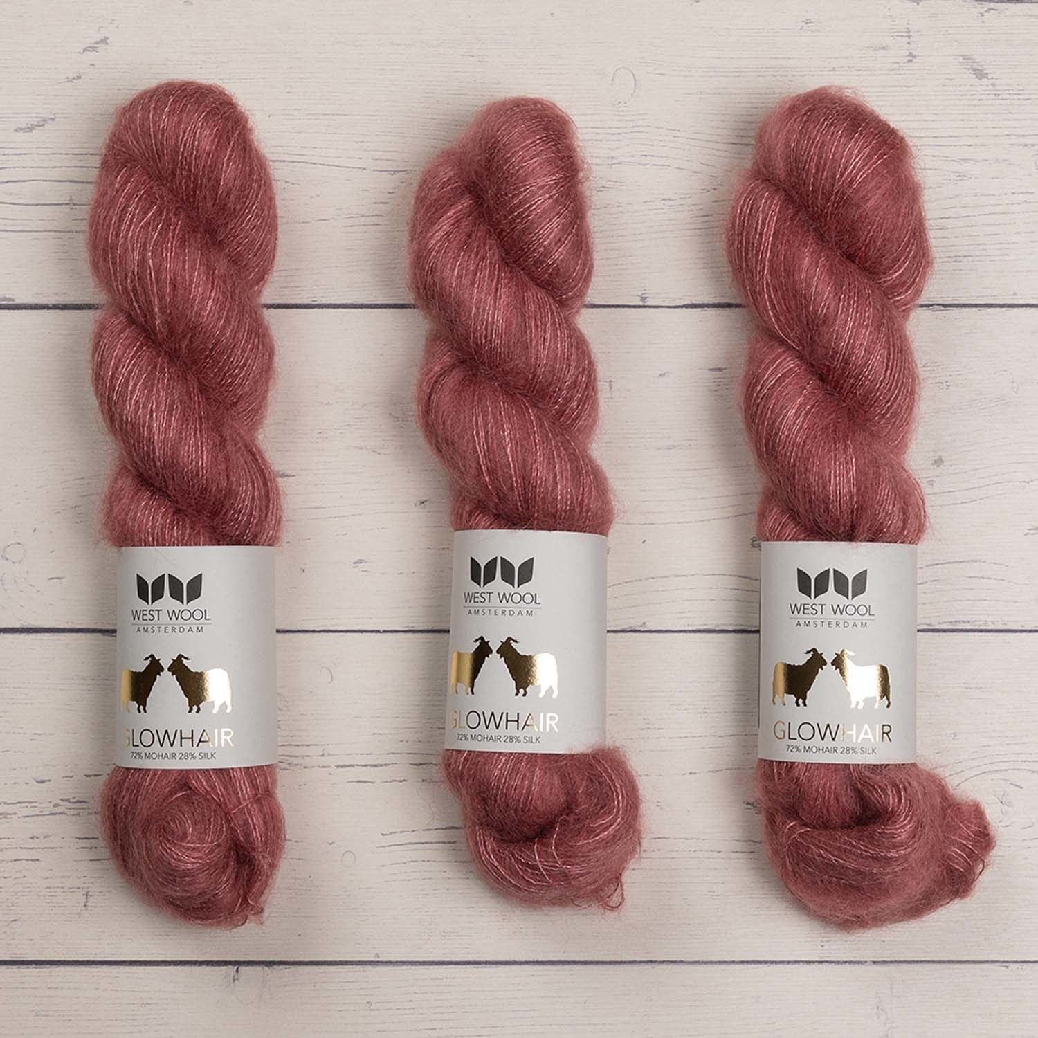 Glowhair is a mohair and silk blend that is soft, fluffy, and silky all at once. The higher content of silk in this yarn gives it a really lovely drape! Roswitha is a dusty medium pink.