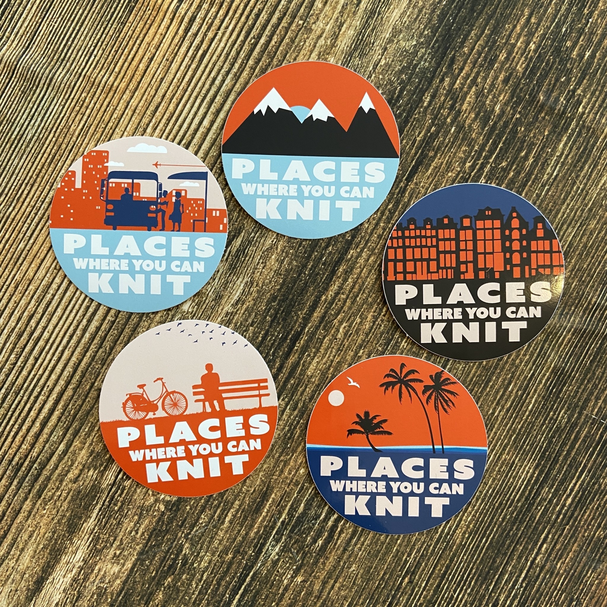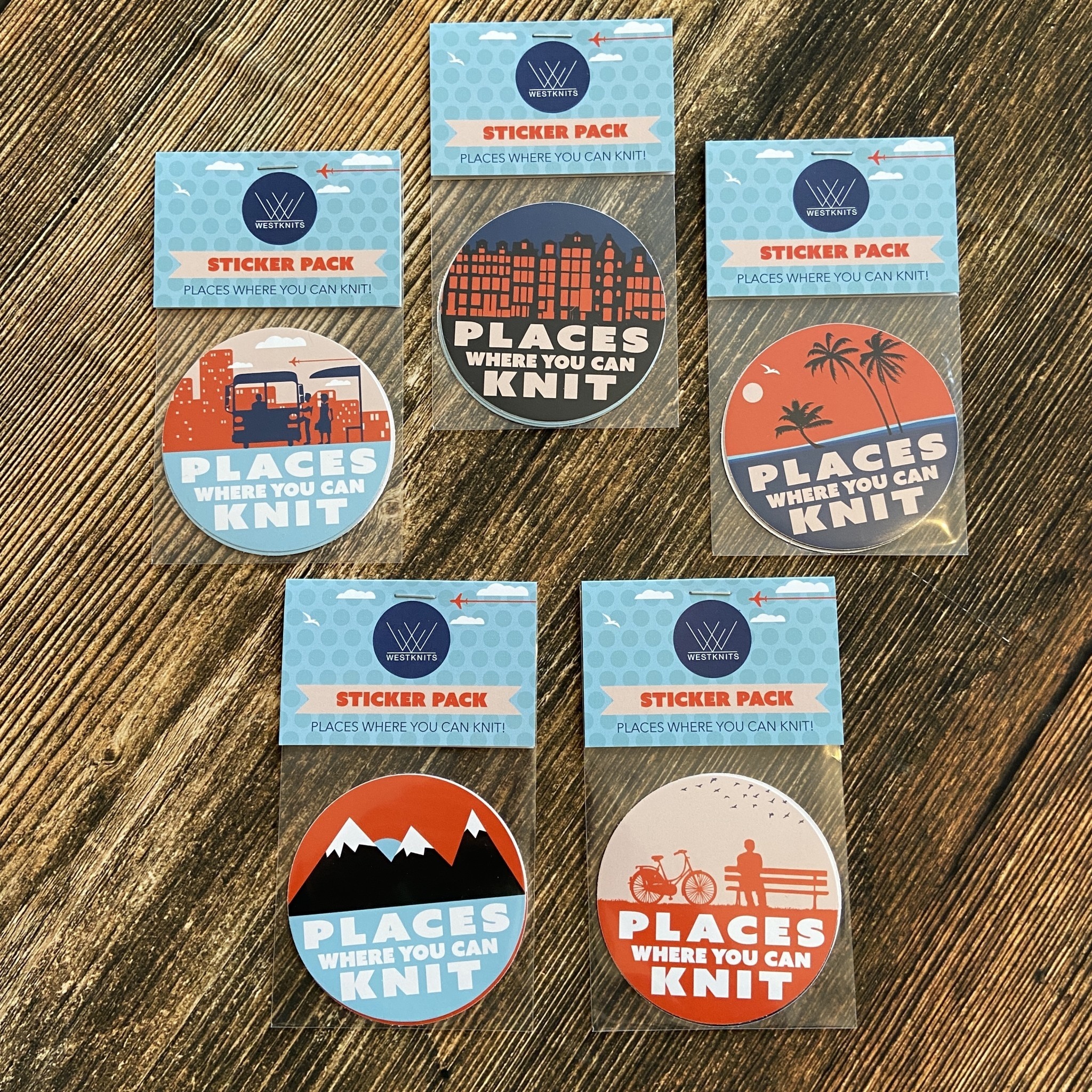 Each five sticker pack contains one of each design featuring Places You Can Knit: