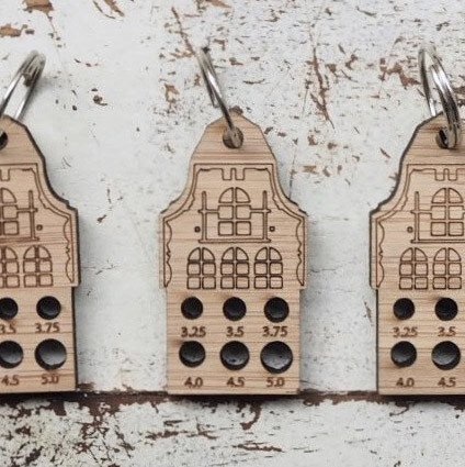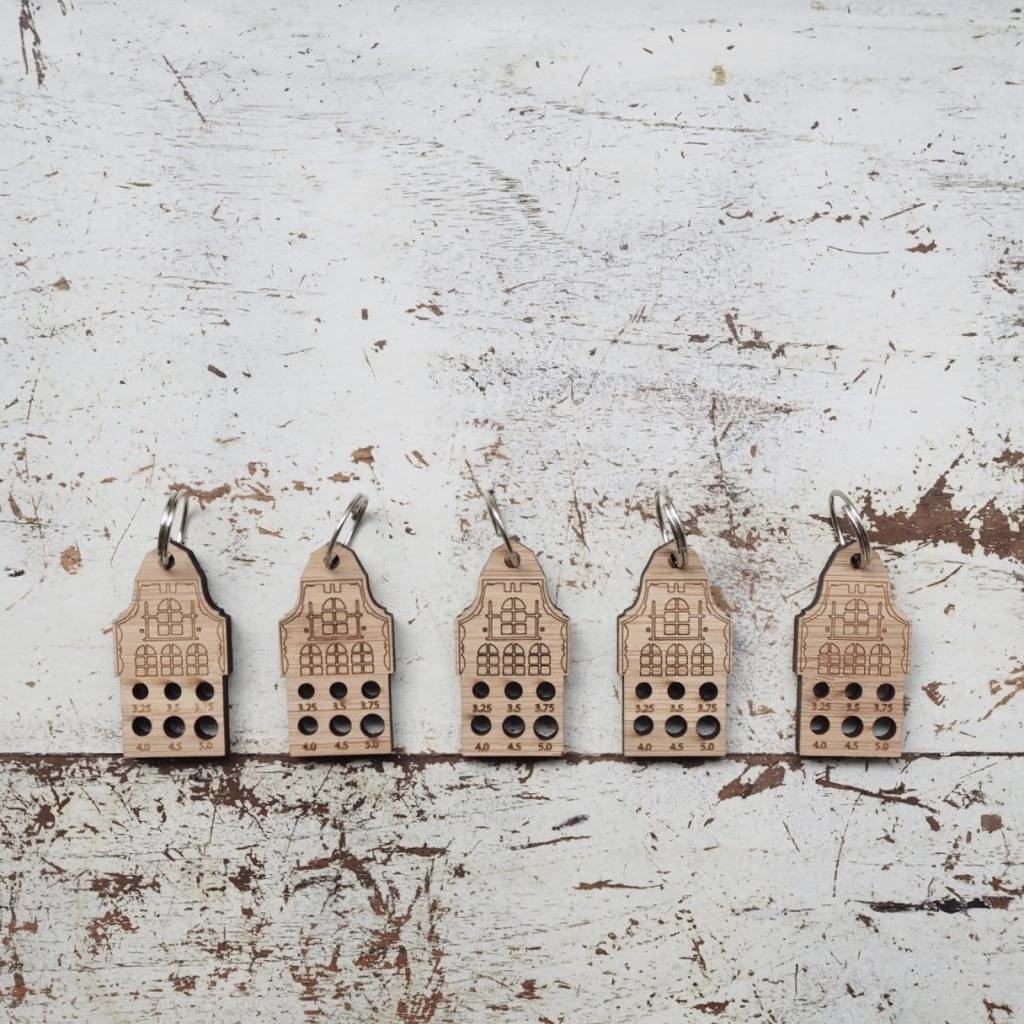 A helpful little tribute to the city of Amsterdam, these little keychains styled like canal houses double as needle gauges. The gauge has millimeter sizes 3.25, 3.5, 3.75, 4.0, 4.5, and 5.0. Perfect for knitters who prefer medium thickness yarns like DK and worsted!