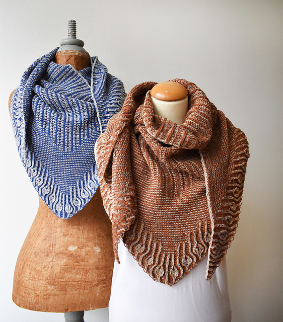 Nancy Marchant's Stitch Trio Shawl begins with a few stitches and uses 2-color brioche with increases and decreases to create the edge stitch pattern. Then a garter stitch section is added and finally a tuck stitch section is added. It’s a fun knit, completely reversible, and not too big.