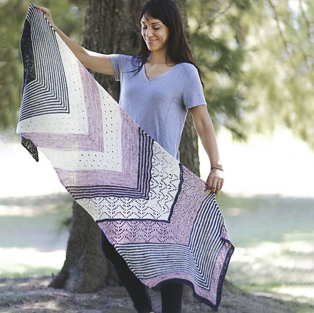 V-shaped on one end and pointy on the other, the Suburban Wrap by Joji Locatelli will keep your interest from start to finish. There’s easy ribbing and garter, some lace, lots of stripes and texture.