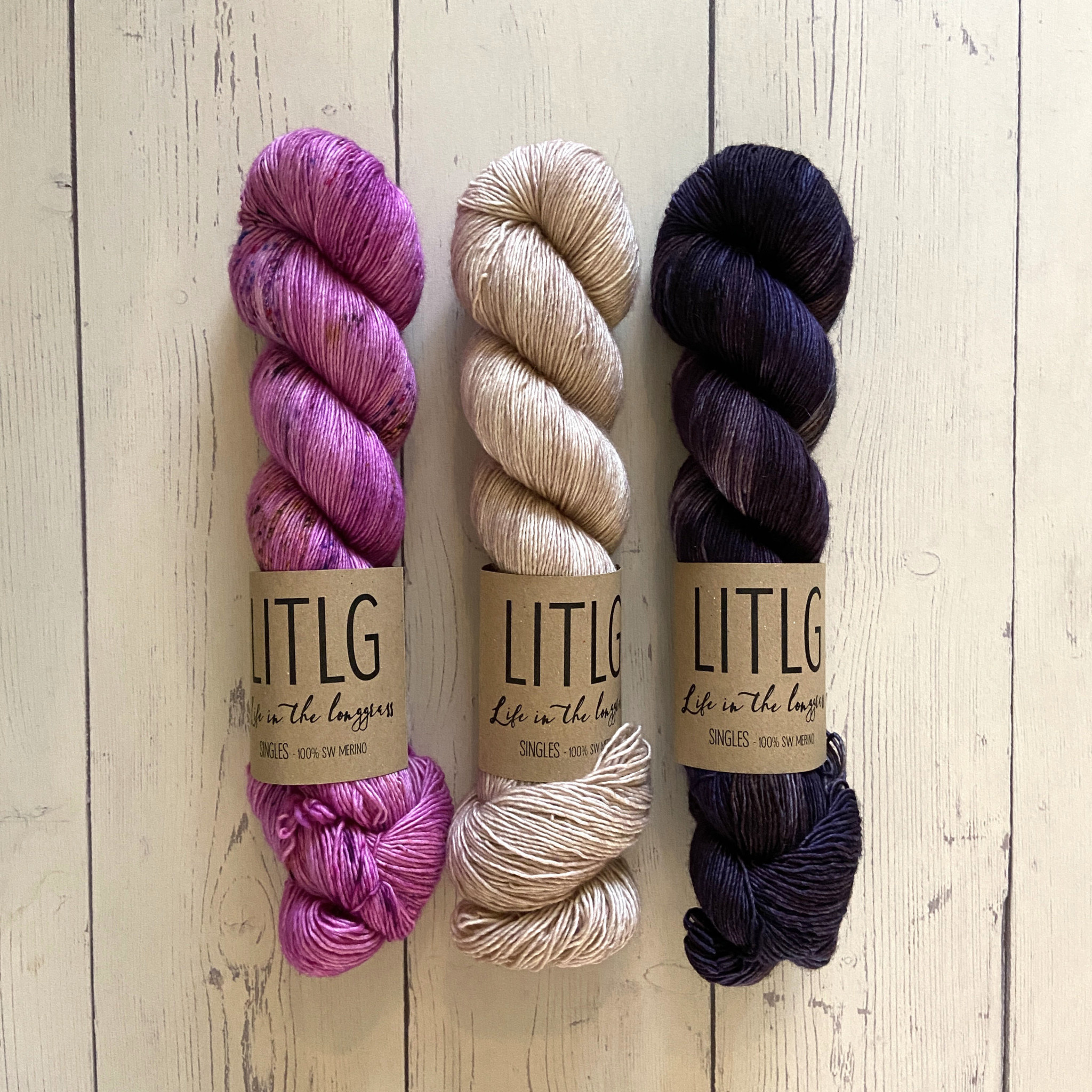 This three skein kit provides the right amount of LIFE IN THE LONG GRASS SINGLES for this great project, in our interpretation of the original colours and a fun alternate. Full pattern details are available here.