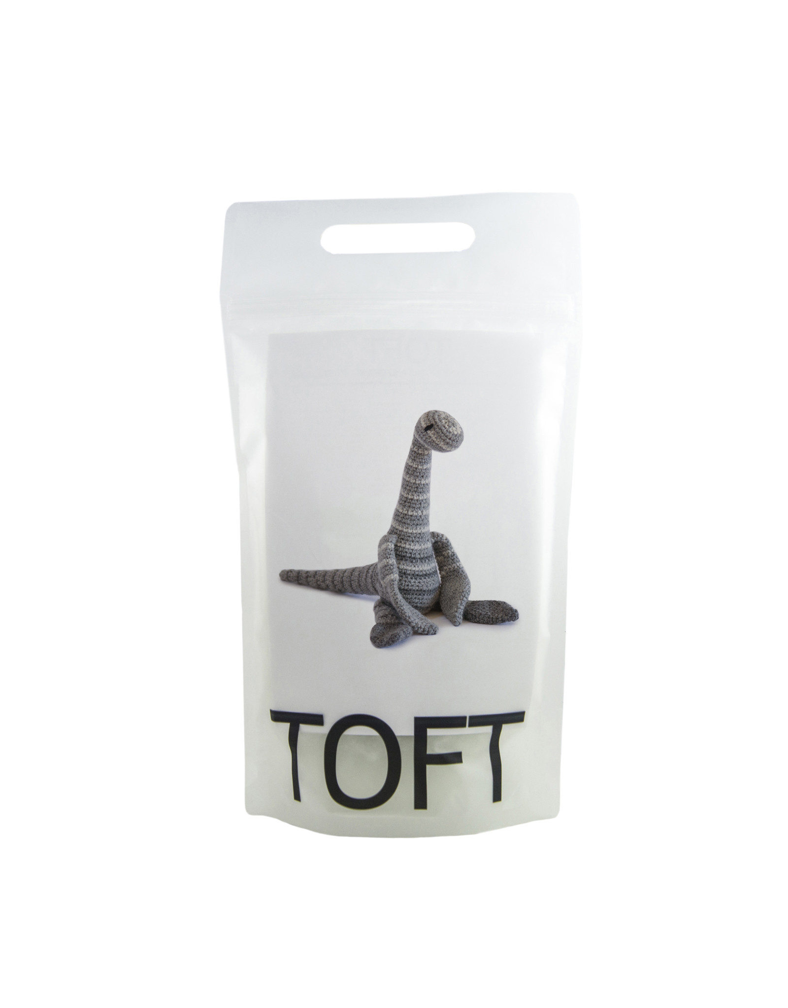 THIS KIT CONTAINS: 50g of Shale, 25g of Silver and 25g of Steel, toy stuffing, 3mm crochet hook, wool needle, and a postcard pattern inside a reusable TOFT project bag.
