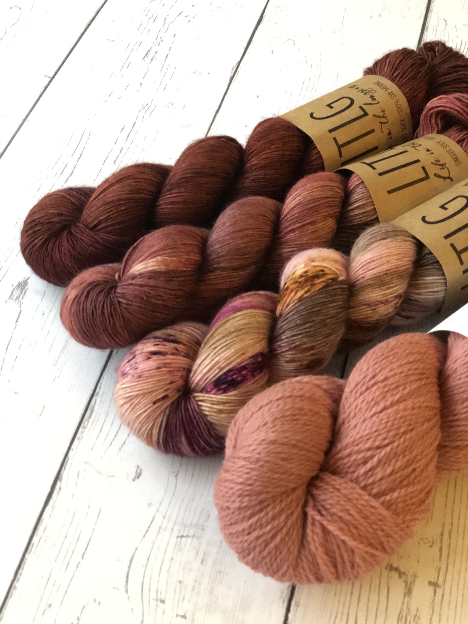 Choppy Waves features one main colour in West Wool Bicycle accented by three hand dyed contrast colours. The increases and decreases form a geometric wavy motif with bands of stockinette and reverse stockinette stitch. A garter stitch chevron border melts the three contrast colours together in this large expansive shawl.