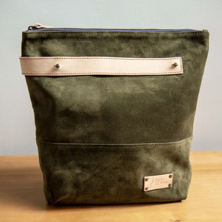 It features 2 inside pockets: a flat one and a zippered one, as well as a clasp to attach your notions pouch.