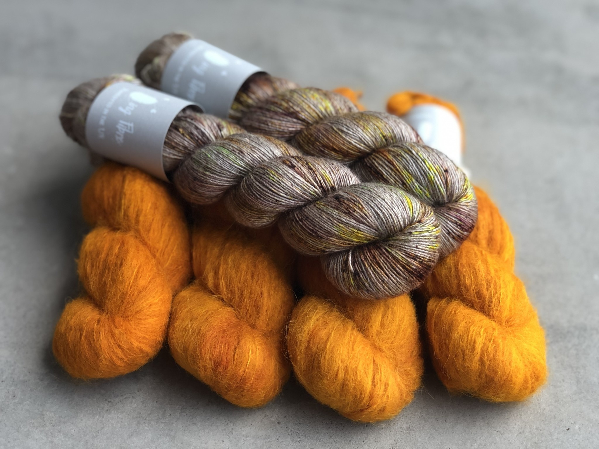Two vibrant skeins of fingering weight hand dyed yarn shine together with the soft, textured complementary Melted Baby Suri peeking from the background, creating a gorgeous fabric that is oh so soft to wear!