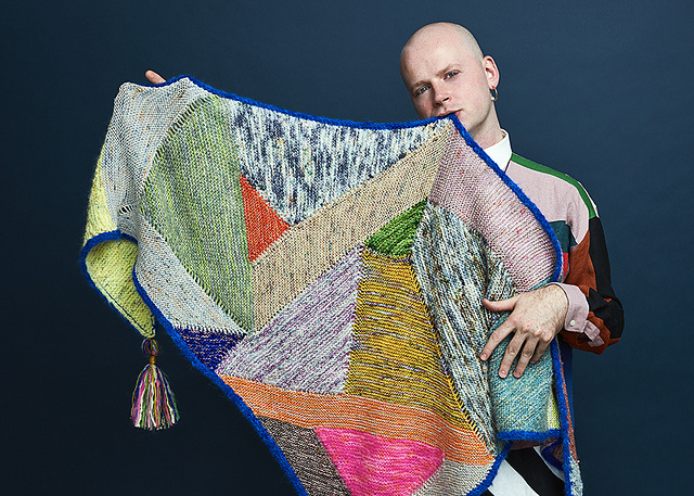 Create a colourful collage using this geometric design to mix and marl your fingering weight yarns together. The pattern is written using eight skeins of yarn, but you can add scraps and leftover bits of yarn to utilise your stash. This shawl is constructed one section at a time as you knit the pieces together, so there is no sewing required. A final I-cord bind off frames the triangular shape. Use this modular design as a canvas to paint and explore marled knitting.