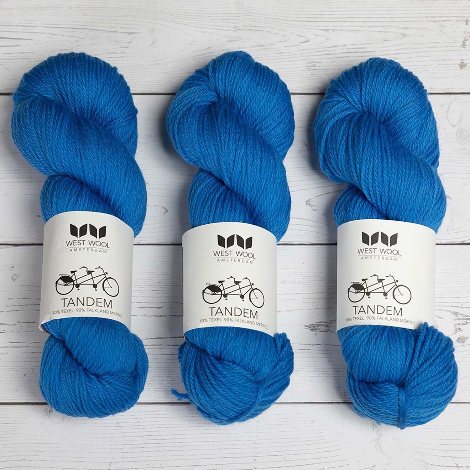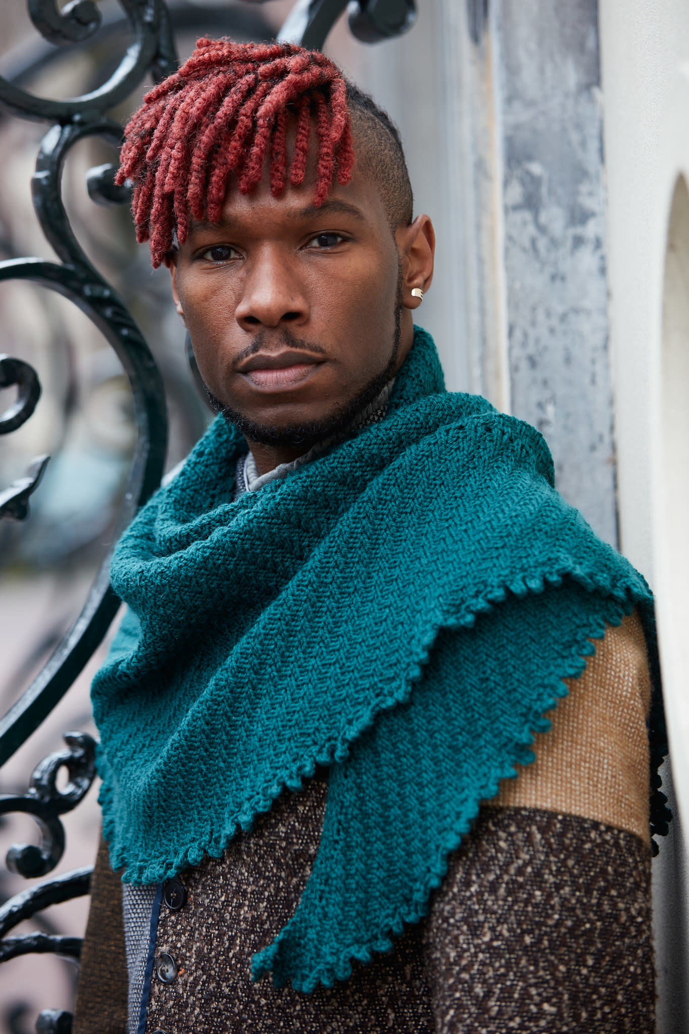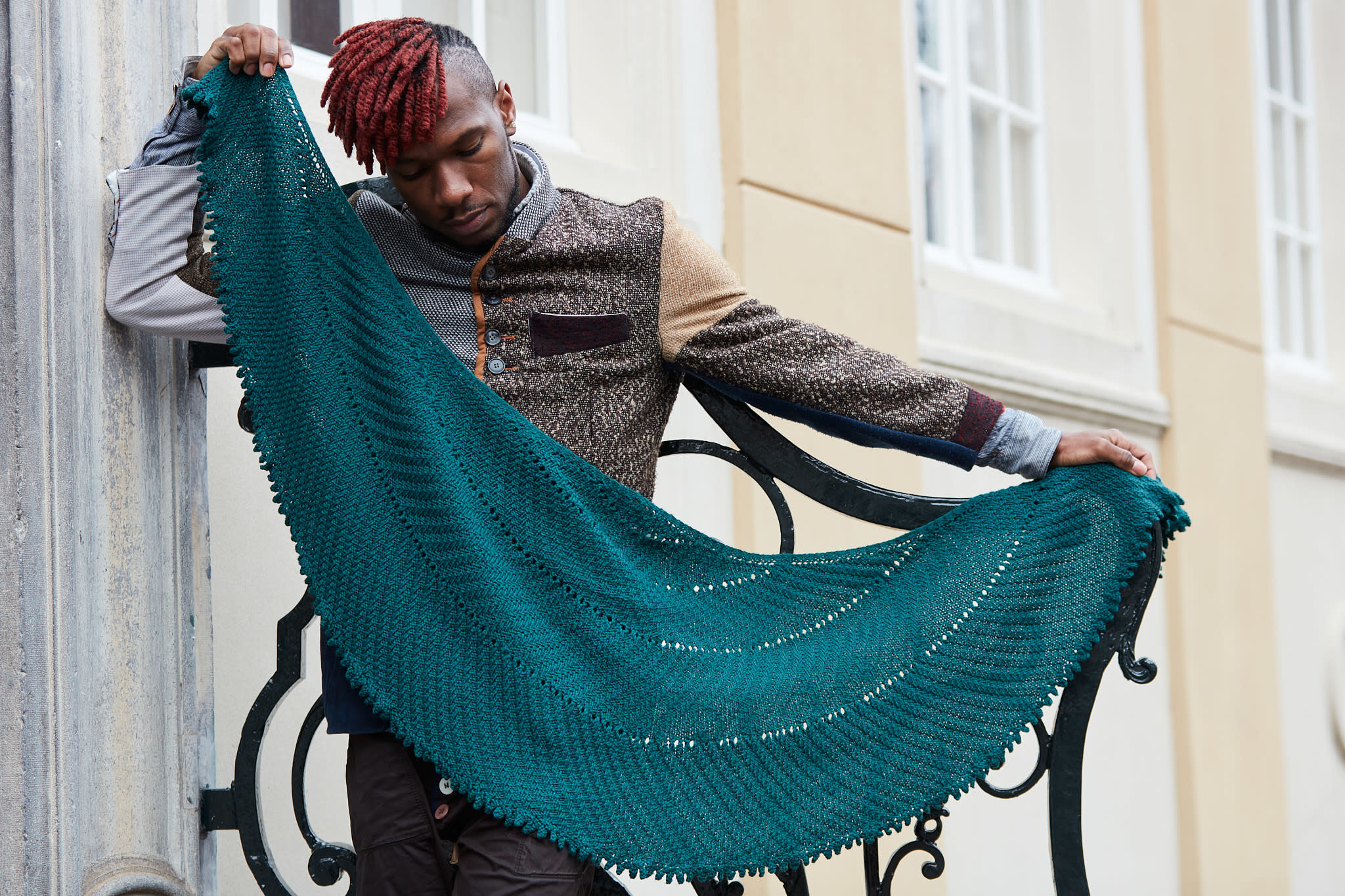 This top-down shawl features a diagonal ribbed texture that zigs and zags while the sections increase in size. Yarn over holes decorate the fabric and a picot bind off neatly finishes the edge. Three skeins of West Wool Tandem yield the large semi-circular shape.