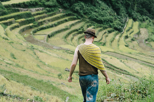 Choose two lusciously soft yarns and cast on for this lovely versatile garment. Stockinette stitch welts and garter stitch short rows are worked seamlessly from the top neck edge. There is only one purl round after each welt so the rest of the rounds and rows utilise quick and easy knit stitches. Every short row turn is accentuated by a yarn over to shape the expanding fabric. Wear it draped over one shoulder or slouchy style as a cowl.