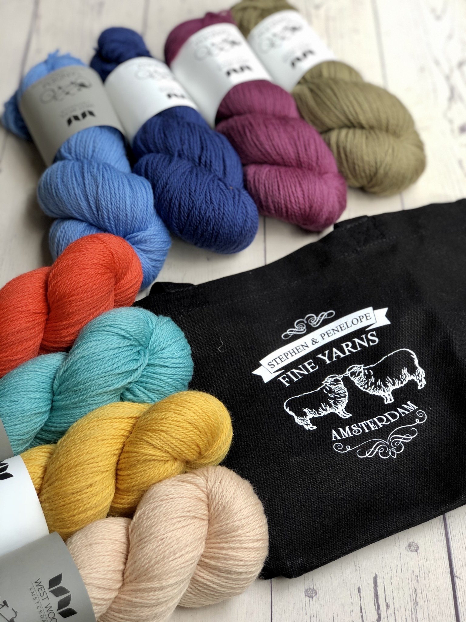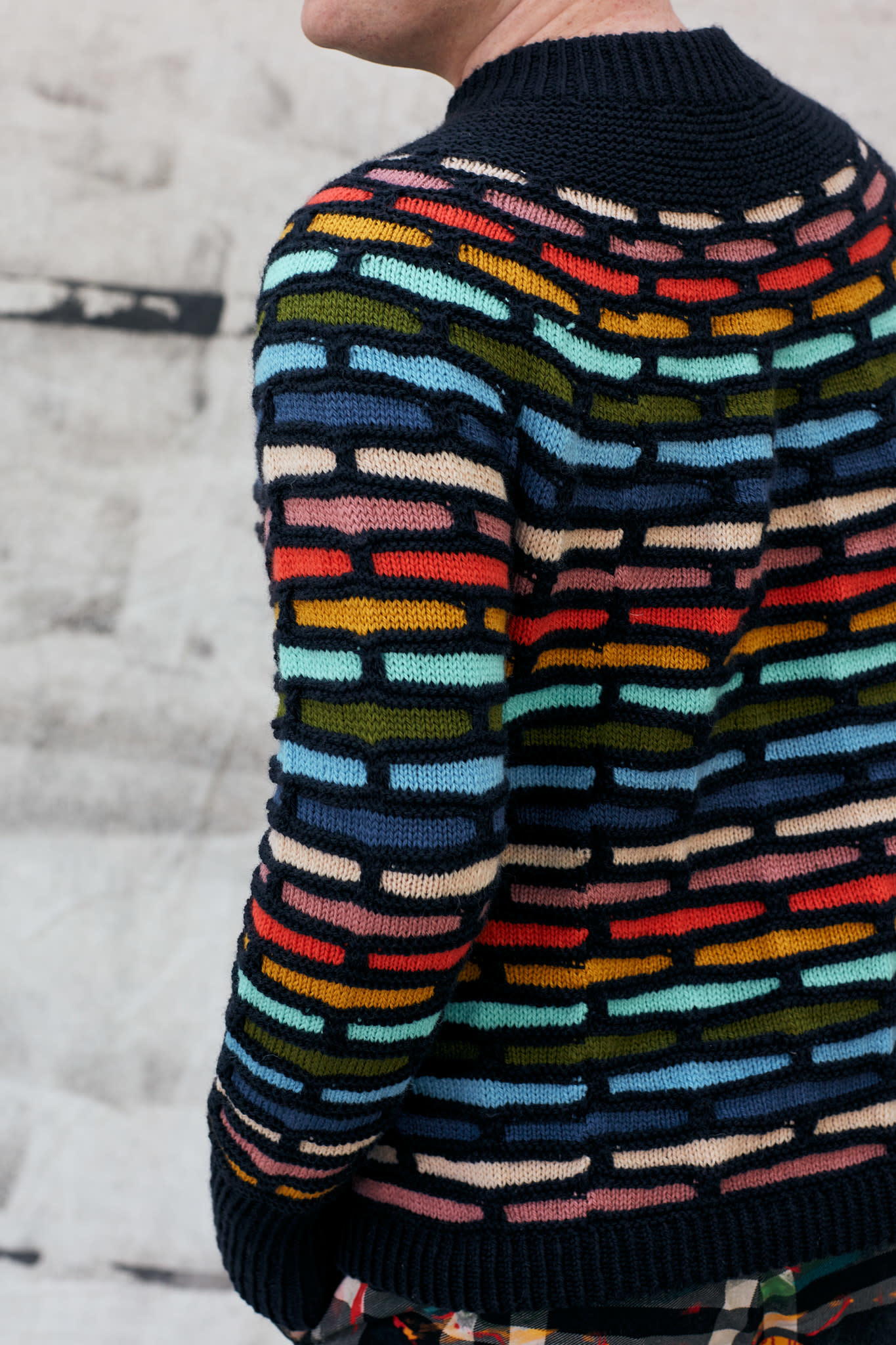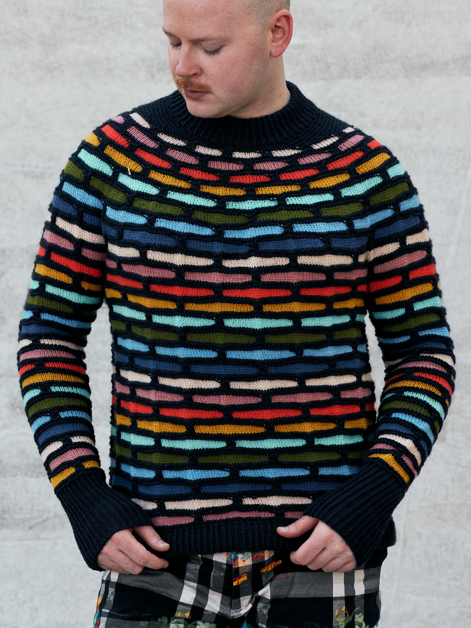 Painting Bricks is knit top-down in our DK weight West Wool Tandem. Each kit contains contrast colours for the colourful bricks. You will need to supplement your chosen contrast colour kit with a main colour in West Wool Tandem or a similar DK weight wool from your stash.